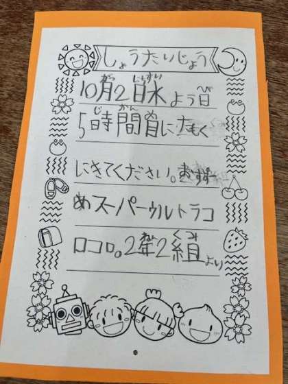 明日にむけて、かわいい招待状が1年生に手渡されていました。