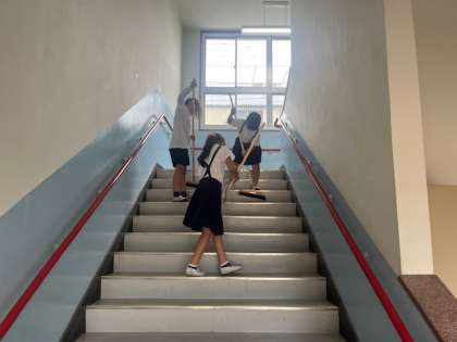 階段は土や砂の汚れが多いので、一生懸命掃いています。