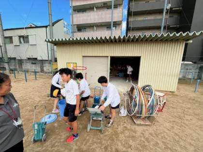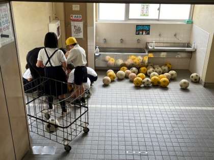 サッカーボールの点検や空気入れ、体育倉庫の清掃、整理をしました。