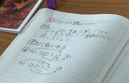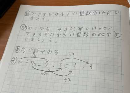 等しい比の性質を使って、比を簡単にする方法を考えました。