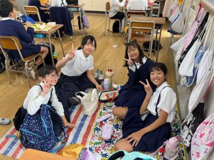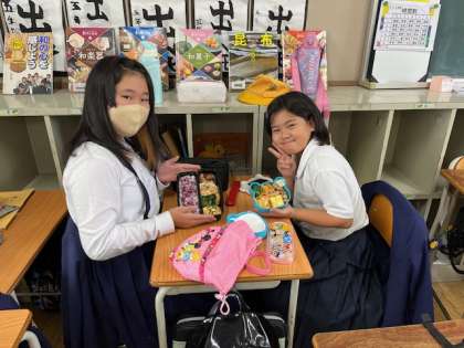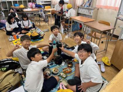 5年生は午後から社会見学へ行くために、教室で友達と弁当を食べています。