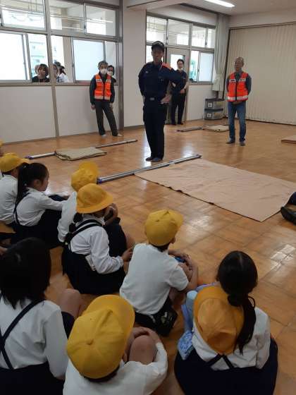 はじめての毛布担架の作り方、一生懸命聞きました。