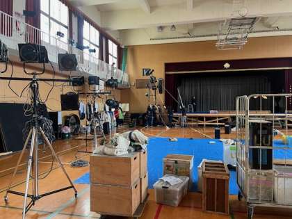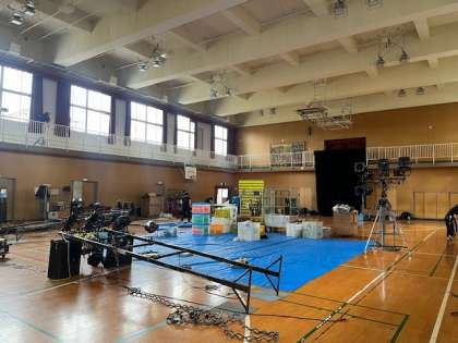 劇団さんが前日準備で、いつもの講堂が大きな舞台に変身しようとしていました。