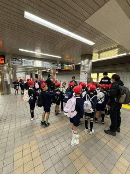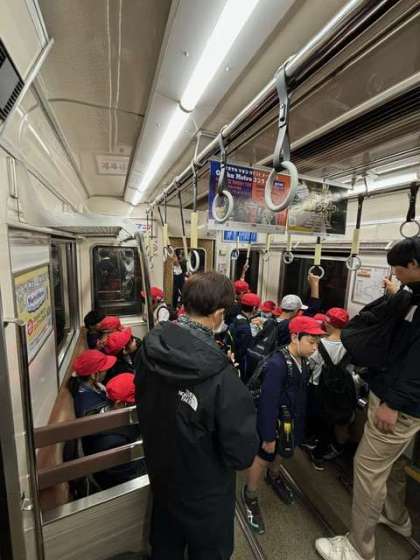 天下茶屋駅から電車に乗って、海遊館に向かいます。楽しく…でも、マナーはきちんと守って乗車中。