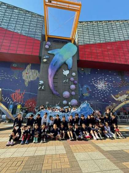 海遊館の前で、3年生全員で記念撮影。ハイ、チーズ!ステキな笑顔がいっぱい!
