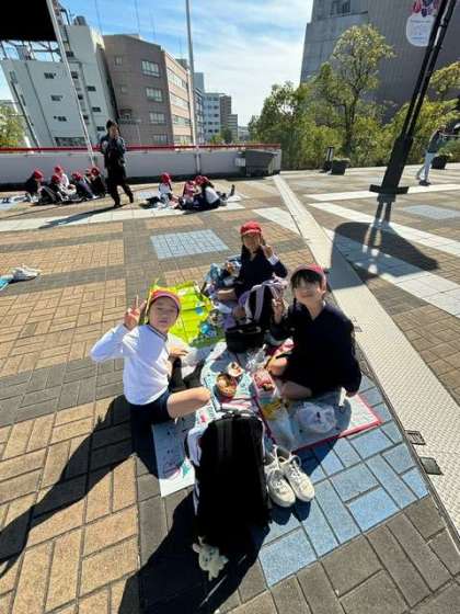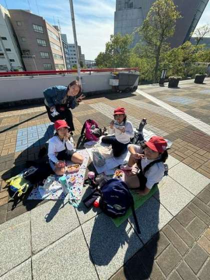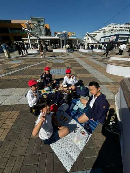見学が終わって、ただ今、お昼ご飯を食べています。みんな、仲良くグループになって、美味しくいただきまーす!