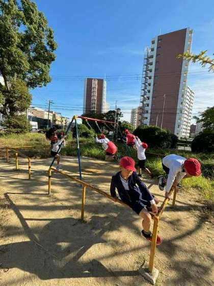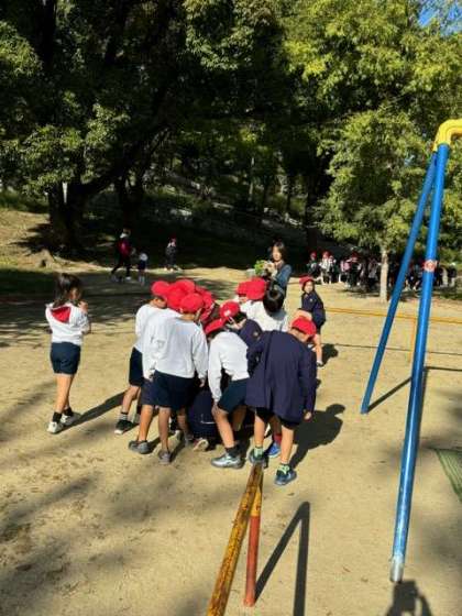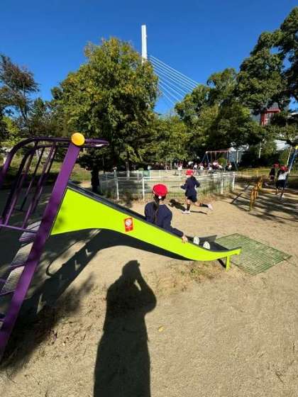 天保山への登山後、近くの公園で自由時間。遊具で遊んだり、鬼ごっこをしたり、虫を探したりなど、楽しい時間を過ごしました。