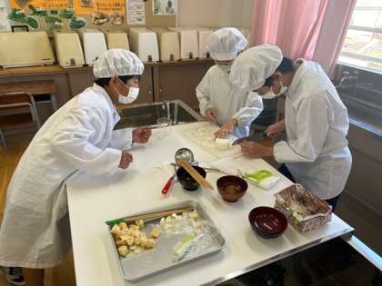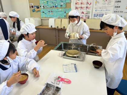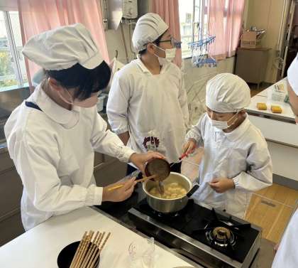 煮干しでだしをとり、大根やねぎを切ったり、味噌をといたりして