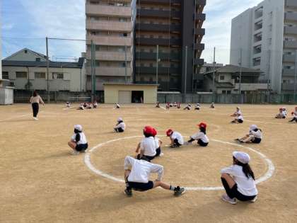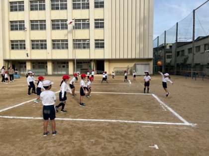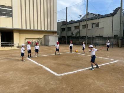 丸や四角のコートにいる人の足を狙って、ボールを投げます。