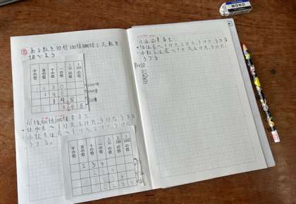 小数を10倍、100倍、1000倍したときの小数点の位置を調べました。