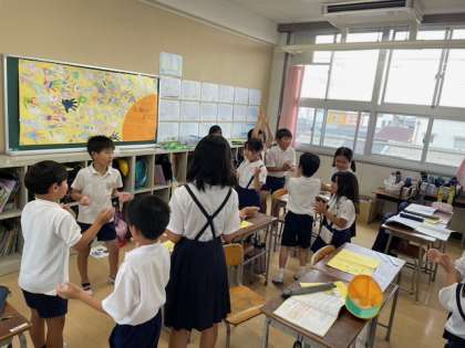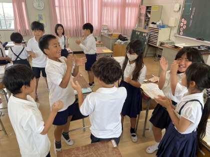 選んだリズムを曲に合わせて打って、同じ仲間同士集まり、
