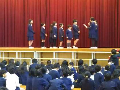 2月8日(木)児童集会において、土曜授業で実施したカルタ大会の結果発表と表彰式を行いました。90点で2班(黄色5班Aと黄色9班A)が、同点優勝となり、優勝、準優勝、3位、フェアプレイ賞の班に、代表委員会より賞状が渡されました。