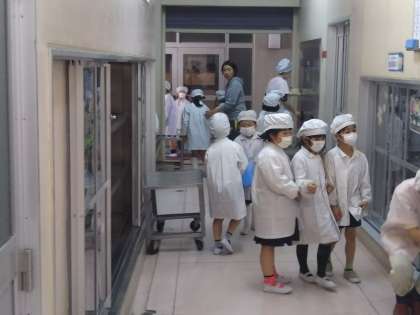 4月10日(火) 今日から給食が始まりました。各学級の給食当番が、給食室へ取りに来て教室で配膳します。