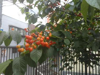 4月25日(水) 運動場の南西角にあるサクランボの木に、たくさんの実がなっています。昨年は、気が付いた時には、カラスや鳥にほとんど食べられていました。