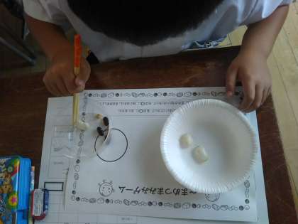 はしのもち方、はしのつかい方、よくないマナーなどを学習し、マメつかみゲームをしました。