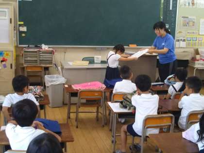 校長先生から”あゆみ”の意味についての話、生活指導の先生から”夏休みの生活”についての話の後、校歌を歌いました。式の後、担任の先生より、一人一人に”あゆみ”が手渡されました。