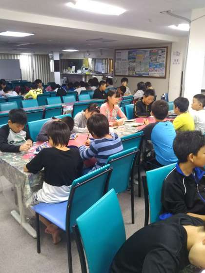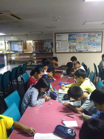 20時50分〔お便り〕宿舎のロビーで、今日の思い出等を便りにしました。