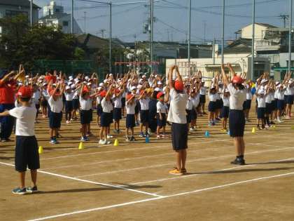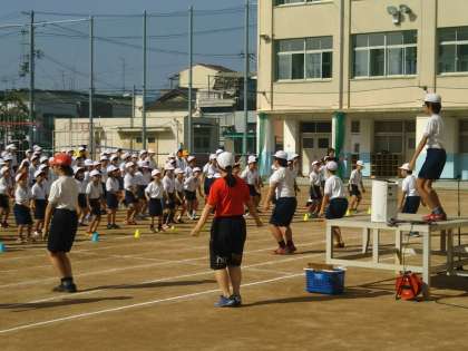 今日の全体練習は、ラジオ体操の練習をしました。係児童が前に立ち、一つ一つの体操を確認しました。