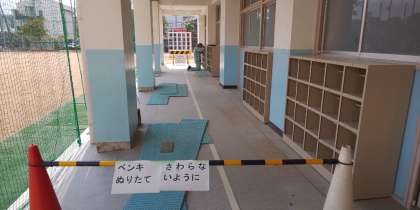 長年の風化により、錆がひどくなっていた多目的室前の靴入れですが、管理作業員さんが丁寧に錆を取り、綺麗に色を塗っていただきました。まるで新品のようです。