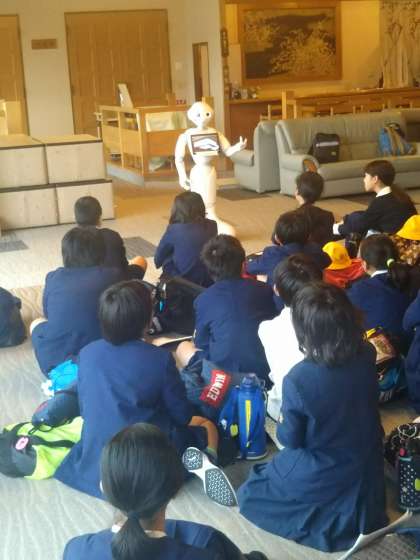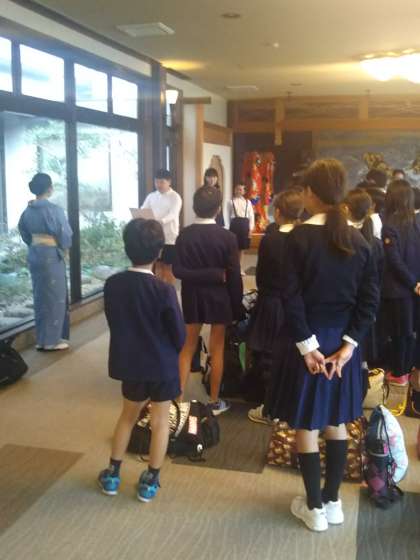 宿舎(みち潮)に到着しました。ロビーで開舎式を行い、代表児童の挨拶の後、"賢ちゃん(ペッパーくん)"から宿舎利用の注意がありました。