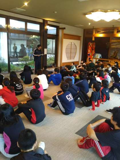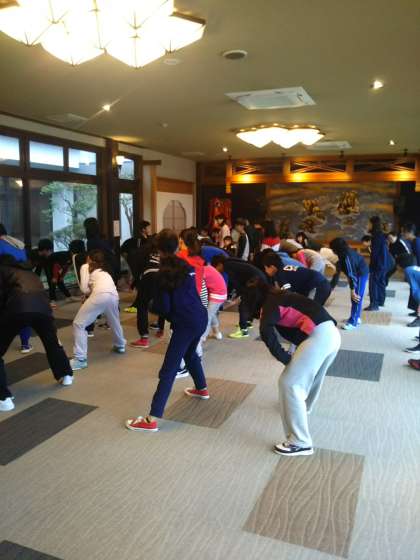 あいにくの雨で外では"朝の集い"ができないためロビーで集まりました。簡単な体操をし、今日の予定を確認しました。