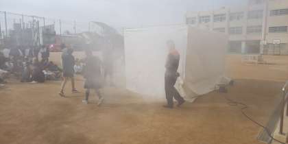 災害発生時に、どのように対処すればよいのかを体験的活動を通して学ぶことをねらいとして、毛布担架・煙体験・起震車・搬送法・座学、防災クイズを体験しました。