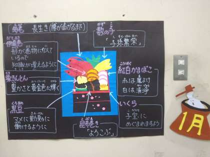 給食室の飾付けも新しくなり、正月バージョンに変わりました。