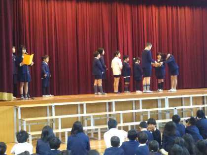 1月の土曜授業で実施した”カルタ大会”の表彰式を行いました。代表委員会から、1位〜3位とフェアプレー賞の賞状が渡されました。1位は97点の青5B班で、2位の黄7A班の82点に大きく差を開けての1位でした。3位は81点で青4B班、フェアプレー賞は青7B班でした。当日はインフルエンザの流行と重なり欠席があったりで、結果として表彰されなかった班も一生懸命頑張っていました。