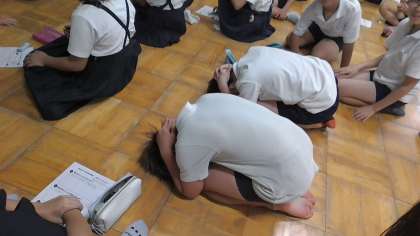 学習が進む中で、「もし、周りに机がない場所で地震が起こったら?」という