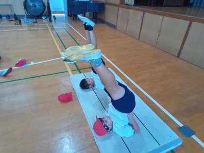 4年生では、新たに開脚前転と開脚後転、側転をしています。