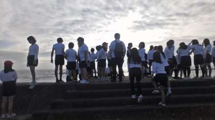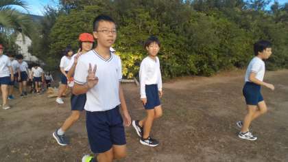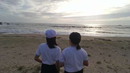 朝の体操を終えた後に、近くの砂浜まで歩いていきました。