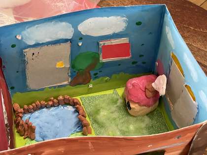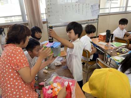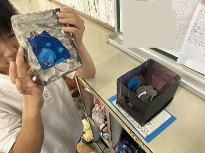 子どもたちは、段ボール箱の中に粘土やアルミホイル、