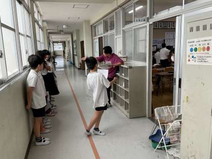 廊下では、地域の企業訪問にむけて、あいさつなどの練習や確認を