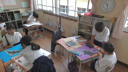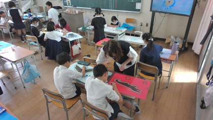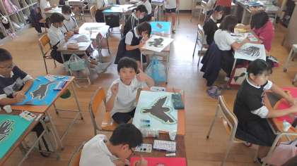 色を工夫してならべたり、等間隔に点を描く集中力、友達と嬉しそうに