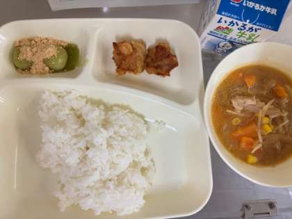 大分県のとり天、北海道のどさんこ汁、京都府の抹茶団子と日本各地の郷土料理を一度に楽しめる献立で子どもたちは楽しんで食べていました!