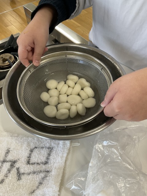 湯が沸騰したら団子を入れて、耳たぶくらいの固さにゆでます。