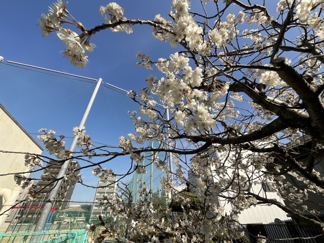 運動場のアンズとサクランボは、きれいに花を咲かせています。