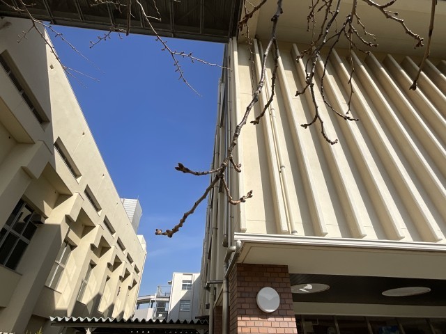 正門の桜はまだつぼみですが、