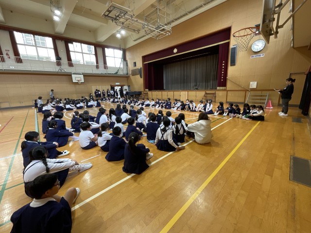 本日、講堂に全校児童が集まり、「1年生を迎える会」を行いました。はじめて全学年が顔を合わせる機会となり、少し緊張しながらも、会場はあたたかな雰囲気に包まれていました。