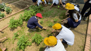 6年生がジャガイモの栽培のために学習園の整備をしていました。 雑草かどうかを見分...