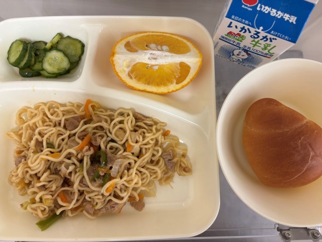 ミニコッペパン牛乳焼きそばきゅうりのしょうがづけあまなつかん焼きそばは、子どもた...
