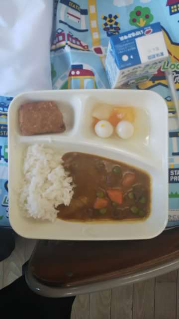 今日のメニューは、「カツカレー、フルーツ白玉、牛乳」でした。