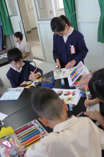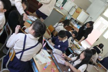 親子丼やステーキ丼など、自分の班の「どんぶり」の絵をそれぞれ描いて班の目印にします。