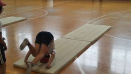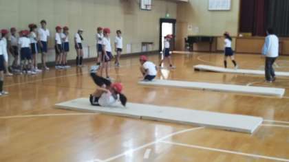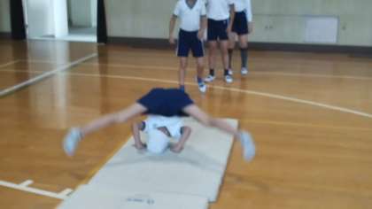 前転、後転、開脚前転、開脚後転、側転の練習をしていました。