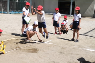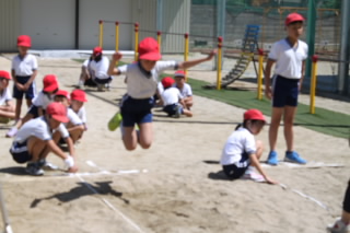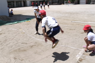 スポーツテストが快晴のもと行われました。梅南津守小のスポーツテストは、一部を除いてたてわり班(どんぶり班)で行われます。
