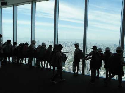 社会科で、わたしたちの町 西成区、大阪市を学習するのに、日本一高いビルに上って大阪市の全体を見ました。近くの四天王寺や南の方には長居のヤンマースタジアムが見えました。