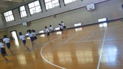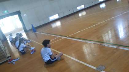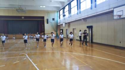6年生が体育館でシャトルランの測定をしていました。持久力を調べます。