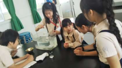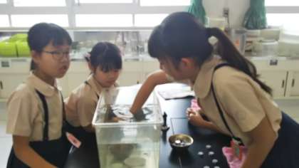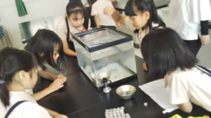 写真は「1円玉落とし」です。水槽のなかに入った入れ物に1円玉を落とします。水の抵抗があってなかなか難しいのです。5枚全部入れた人はすごいです!