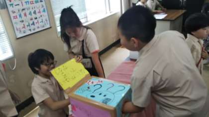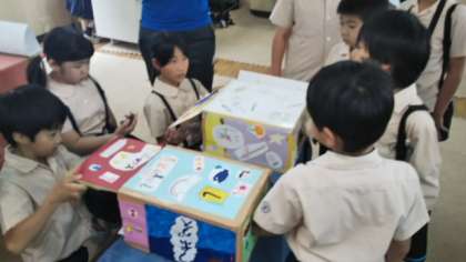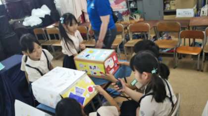 写真は「?(はてな)ボックス」です。箱の中の物を手探りで当てます。