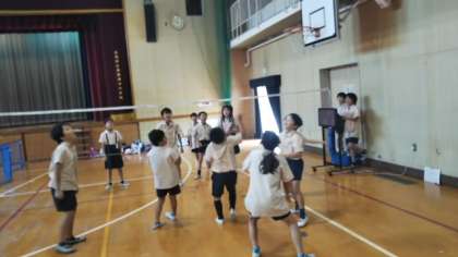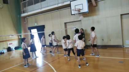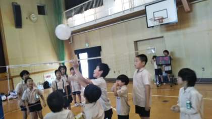 写真は「風船バレー」です。風船でバレーボールをするのですが、落ちずに良くゲームが続くので、人気があります。